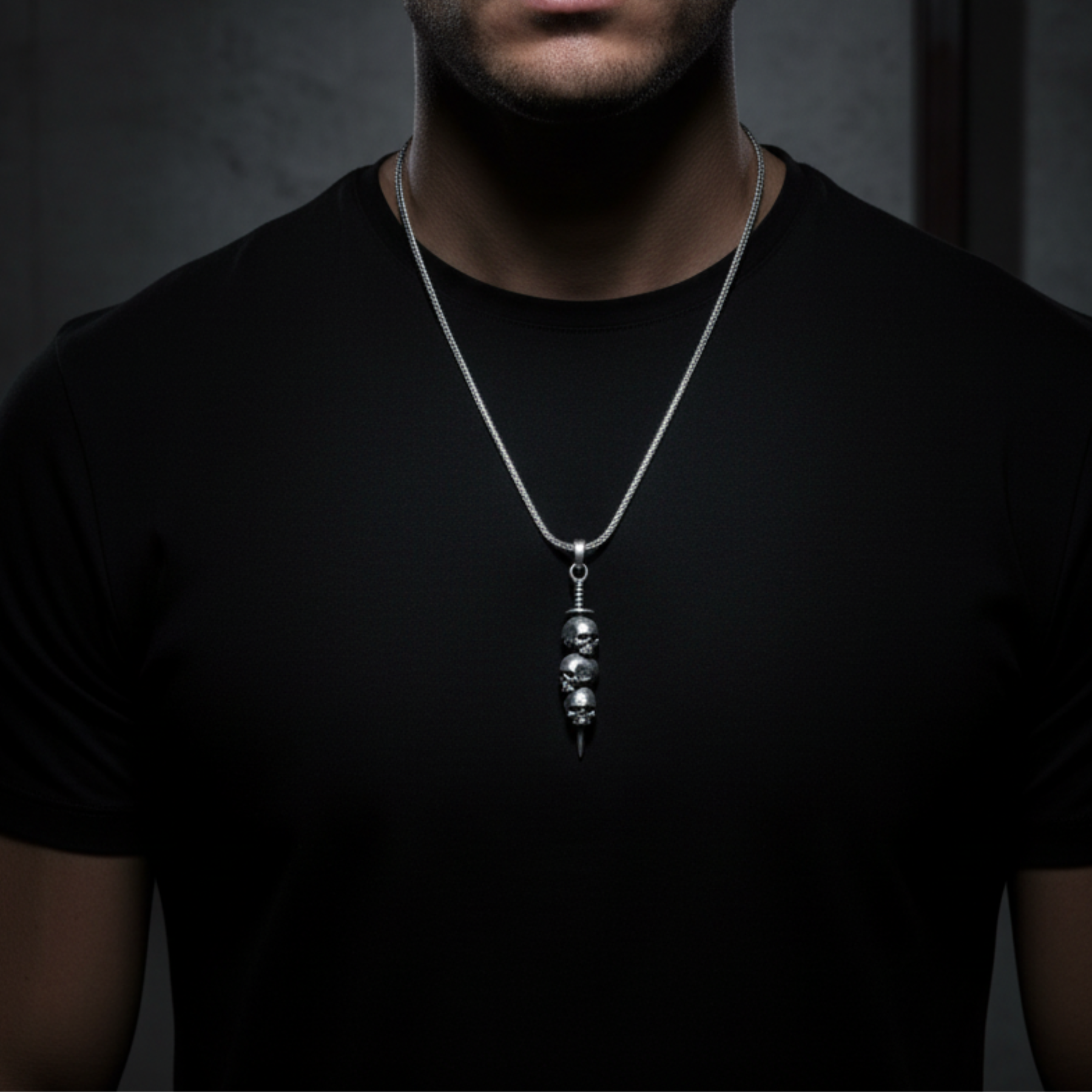 Gefertigt aus massivem 925 Sterlingsilber, zeigt der Anhänger drei detailreich gearbeitete Totenköpfe – ein Sinnbild für Vergänglichkeit, Stärke und Unerschütterlichkeit.