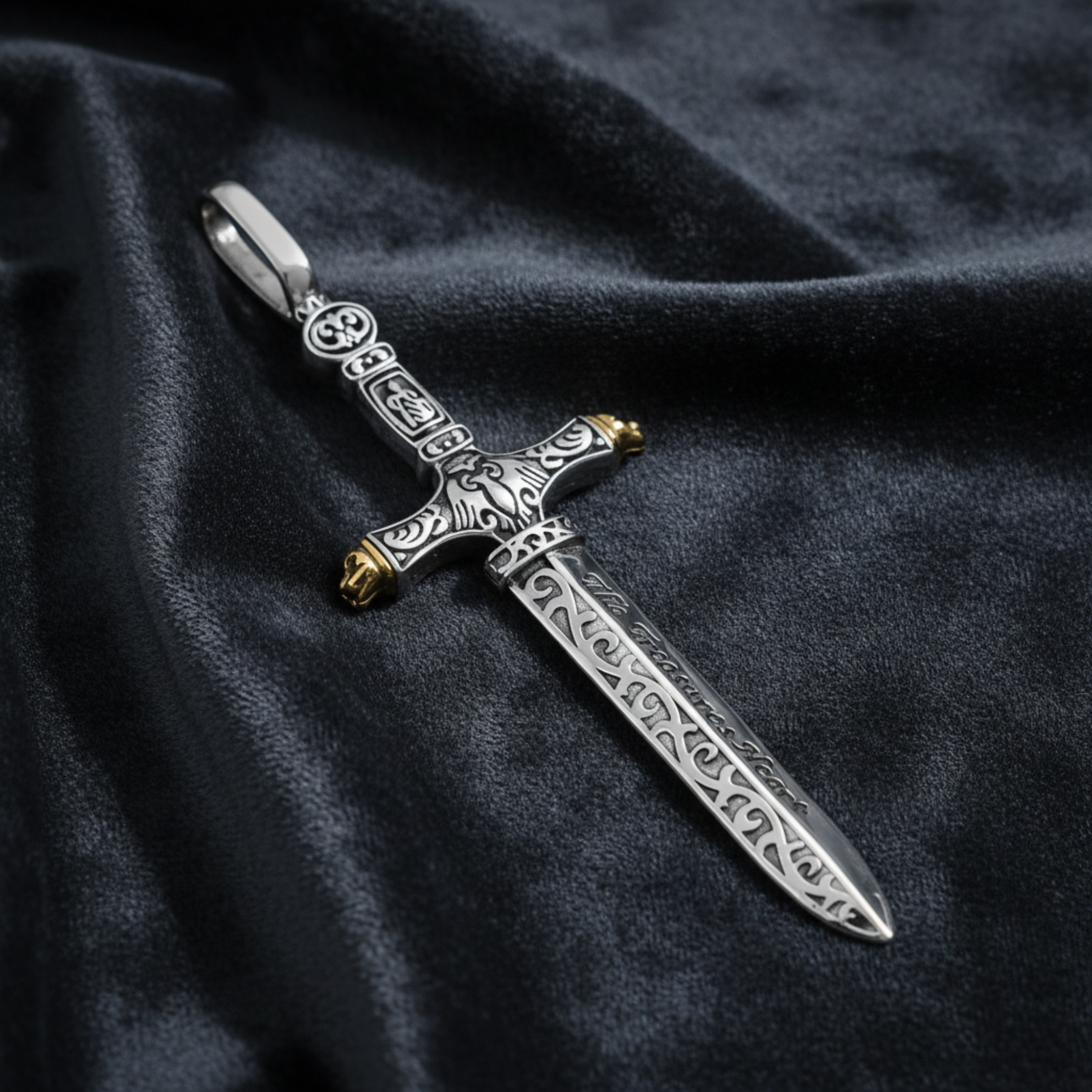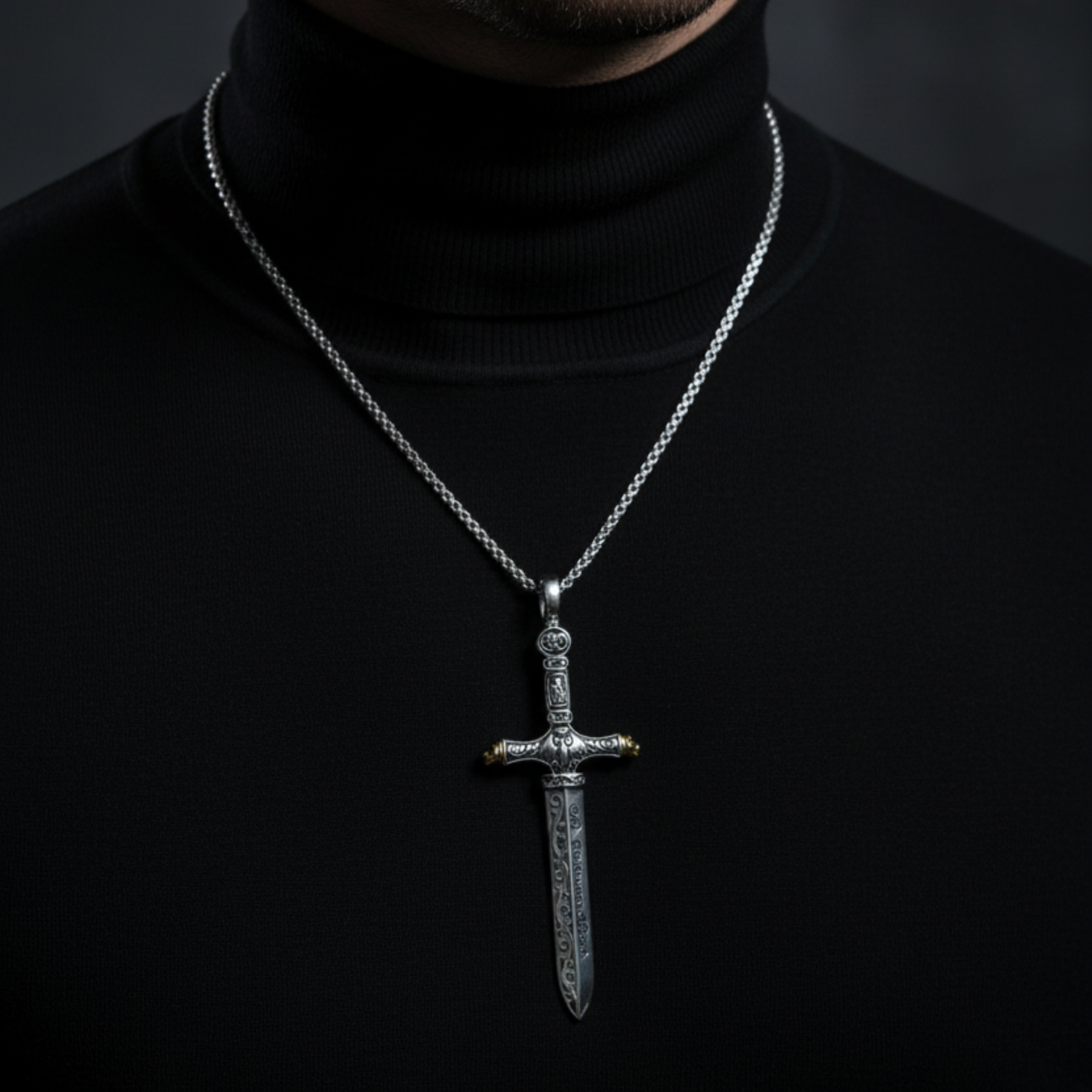 Gefertigt aus massivem 925 Sterlingsilber, vereint das kunstvoll gravierte Schwert-Design mittelalterliche Symbolik mit modernem Stilbewusstsein.