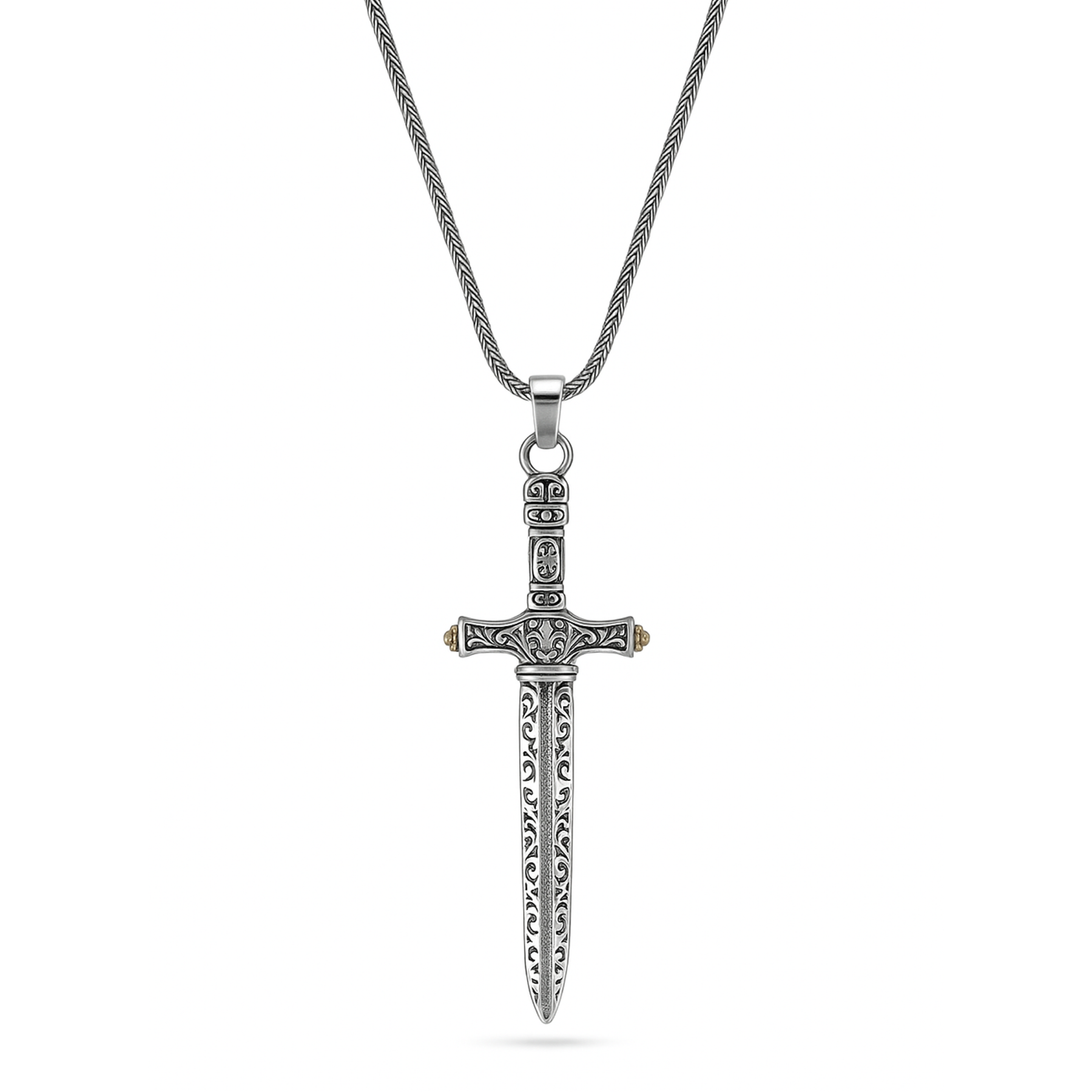 Gefertigt aus massivem 925 Sterlingsilber, vereint das kunstvoll gravierte Schwert-Design mittelalterliche Symbolik mit modernem Stilbewusstsein.